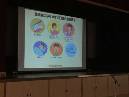 健康な歯を維持するためには、口の中を清潔に保つことと。歯の周りの歯垢、唾液の汚れがムシ歯発生に大きくかかわっており、きれいなサラサラな唾液を出すことと話されました。