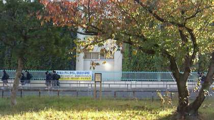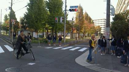 11月10日(金)の朝の正門前の交差点からの登校時の様子です。北之町公園の桜が、冷え込みとともに急に葉の色が変化し始めました。紅葉の時期がやってきましたね!!樹木の上のほうから変色し始め、赤色・黄色と緑色が同時に朝陽を浴びて輝いています。