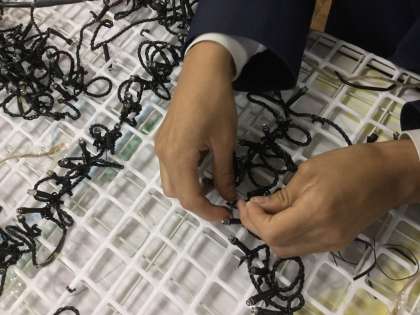 メッシュパネル(180cm×90cm)に、LEDライト15本(100球・10mの6色あり)を結束バンドで留めていきます。