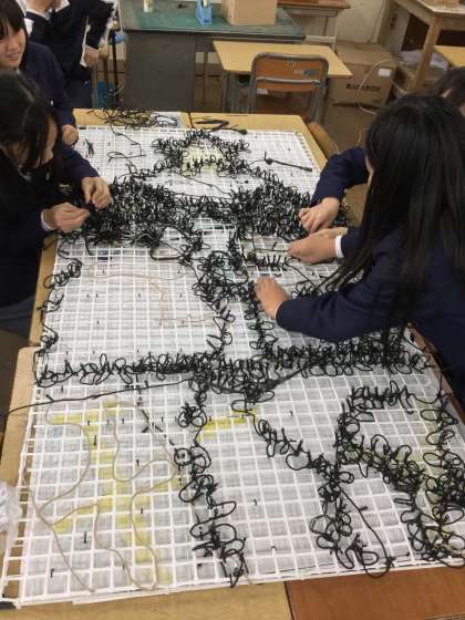 下絵に忠実にしたがって配線をして留めていく、根気のいる作業です。