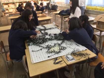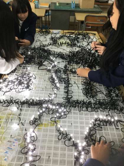 電源につないでLEDライトを試験点灯してみて、確認してまた配線を留めていく試行錯誤の作業でした。LEDライトの数に限りがあり、配色とバランスを考えて制作することが大切です。