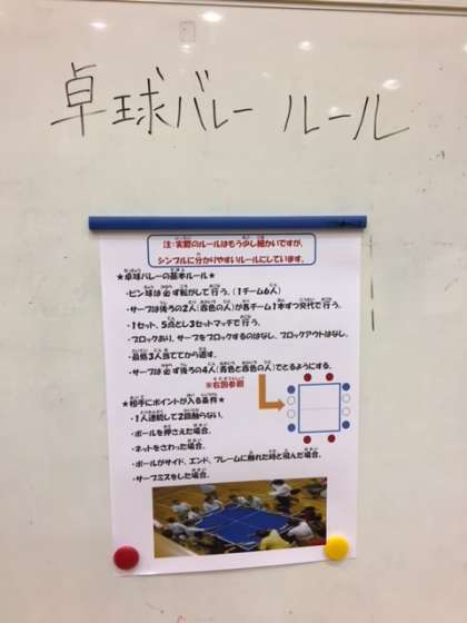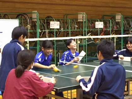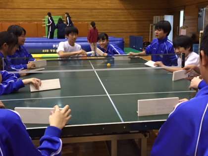 卓球バレーボールをしています。1チーム6人編成で、ピン球を転がしてのゲームです。