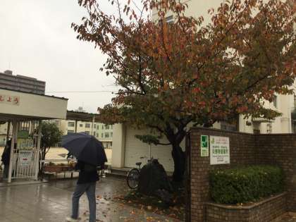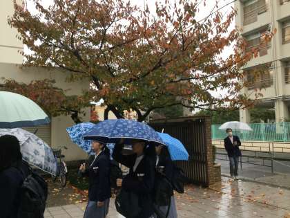 正門わきの桜は上の方が紅葉となりましたが、地面に近い方はまだ緑色の状態です。地面には落葉した葉っぱが、適度な距離感でちりばめられています。赤色・オレンジ色・緑色に、そして傘の色が加わり、色彩的にカラフルでにぎやかな秋を演じてくれていました。