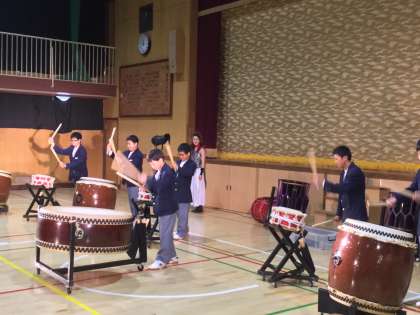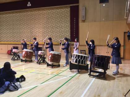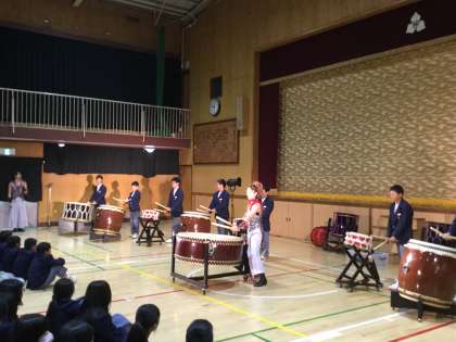 和太鼓体験コーナーでは、各クラスから代表1人が前に出てきて、合計11人が太鼓をたたきました。バチの持ち方や、右足を引いて太鼓の真ん中をたたくことを学びました。リズムの取り方を学び上手にたたけていました。大きな太鼓に挑戦した生徒もありました。