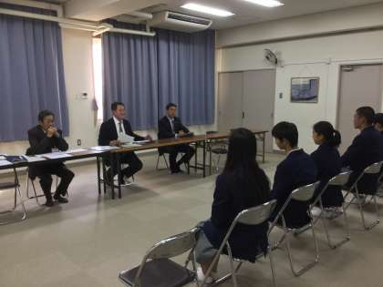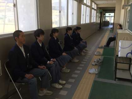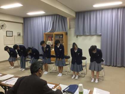 校長面接はミーティング室で行う集団面接です。面接官に好文学園高等学校から先生をお迎えしての面接です。好文学園高等学校の先生は、入学試験のときに実際の面接を担当される先生方です。歌島中学校の校長先生とともに面接をしていただきます。