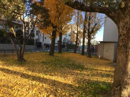 北之町公園のサクラの葉っぱは落葉し冬の装いです。最後の紅葉となった銀杏(イチョウ)は、樹木全体が見事なまでに黄色一色に染っていて見ごたえがあります。今まさに葉を落としつつあり、地面は黄色のじゅうたんを敷き詰めたようでした。