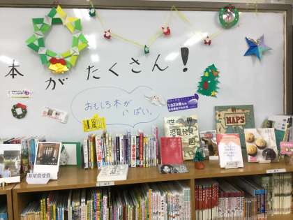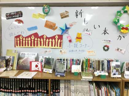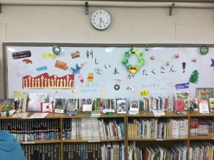 学校の周りの景色も、落葉とともに秋が去り冬の装いです。学校図書館補助員の西本さんに、12月バージョンの新しい新しい掲示にしていただきました。間もなく迎えるクリスマスのツリーとたくさんの飾りたちです。