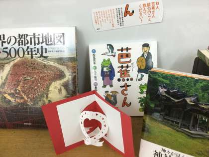おりがみや画用紙をくりぬいた、カラフルなクリスマスの飾り満載です。クリスマス飾りに見守られるように、書庫の上面には新しい本が所狭しと並べられています。