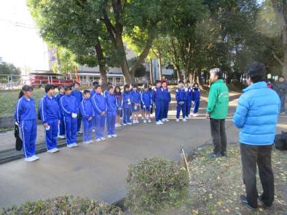 大野川緑陰道路クリーン大作戦は各所で行いましたが、最後は4中学校の生徒が1か所に集合しました。塩屋西淀川区長や市会議員の佐々木さんも駆けつけてくださり、あいさつをいただきました。お話のあとには各学校の校長先生や生徒会担当の先生も加わって、参加者全員で記念写真を撮りました。
