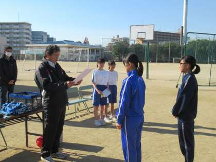 整列して競技開始のあいさつです。天気にも恵まれ力いっぱい白熱した戦いを制して、歌島中学校生徒会は、見事優勝を勝ち取りました。