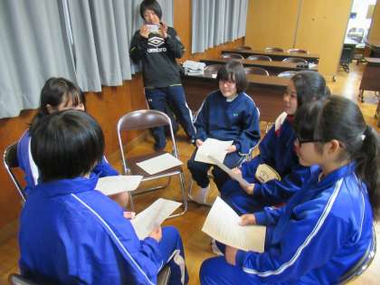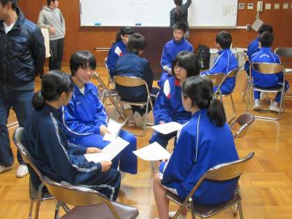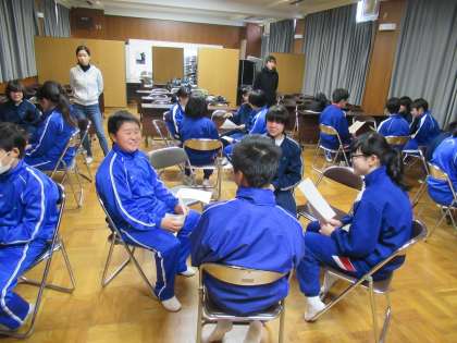 近隣中学校の生徒会役員同士の交流会で、清掃活動・球技大会を経て、最後は意見交流会でした。