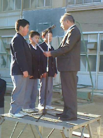 最初に、12月10日(日)に西淀川区4中学校の生徒会交流会にて行われた、球技大会での優勝の表彰でした。副校長先生より生徒会を代表して、男子生徒会役員に表彰式が渡されました。
