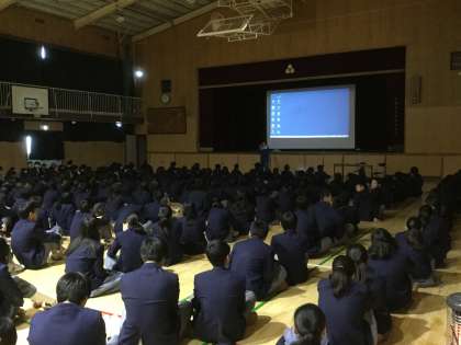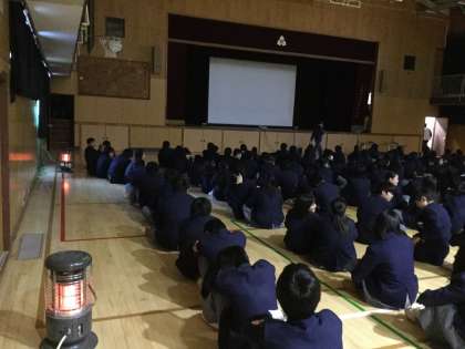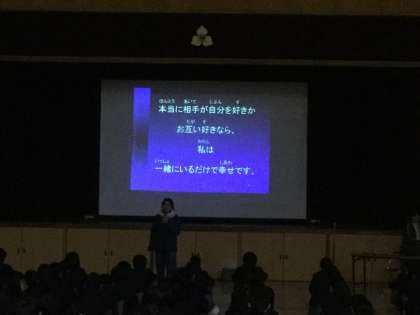 12月20日(水)6時間目に、3年生の総合の時間に、体育館で性教育「性感染症・エイズについて」がありました。歌島中学校の性教育委員会の先生方にプロジェクターを利用しての授業をしていただきました。