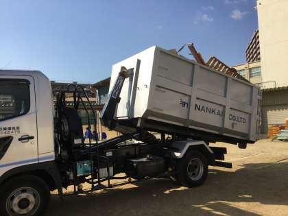 アームロール車は、トラックの荷台からスライド式にコンテナを地面に下ろすことができる作業車でした。たくさんの物品を詰め込んで重そうなコンテナを、アームでトラックの荷台へといとも簡単に引っ張り上げていきます。