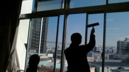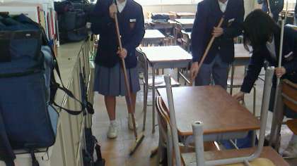 各教室ではほうきで掃き掃除する人。黒板のチョークケースを掃除する人。高所のガラス磨きする人。スイーパーで汚れた水分をふき取る人。
