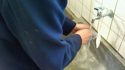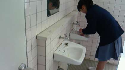 トイレでは床のタイルを、ホースで水をかけながらデッキブラシで磨きこんでいました。またトイレの手洗いをきれいに磨いている生徒もいました。