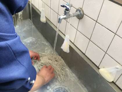 最後は使用した道具の洗浄と後片づけです。モップを一生懸命に洗ってくれている姿が印象的でした。