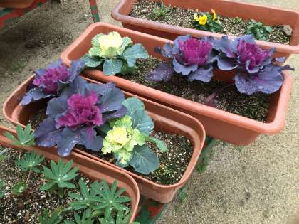 正門前の花壇では、葉牡丹が見ごろとなり正月らしさを演出してくれています。昼前から降り出した雨が、葉っぱのうえで大粒の雨粒となっていました。