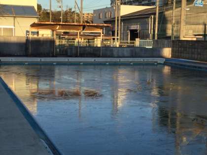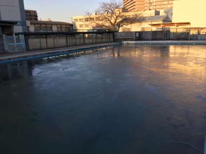 歌島中学校のプールも今冬初めて凍結しました。建物に反射した朝陽で幻想的な風景に仕上がっていました。