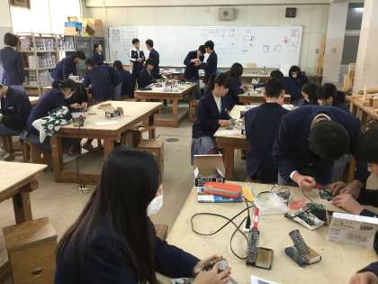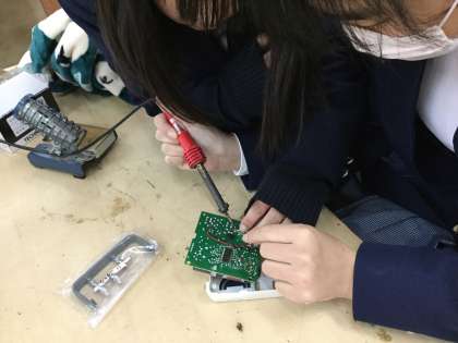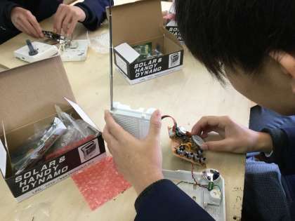 電気分野で、ソーラーラジオの作成をしていました。基盤に半田ごてで配線の接着や、ラジオの周波数の調整をしていました。