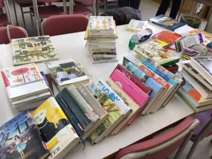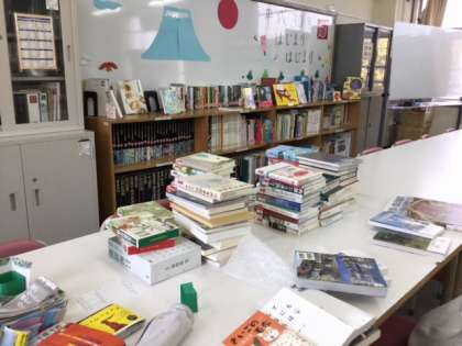 新しく購入していただいた本が1月15日(火)に多数図書室に納入されました。さっそく「学校図書館補助員」の西本亜樹子さんに、分類ごとに仕訳をしていただいています。
