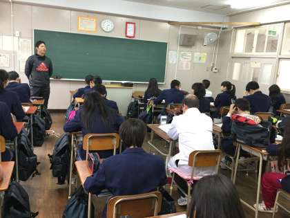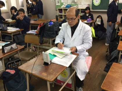 1月17日(水)5〜6限目に2年8組の教室で、学校薬剤師の宇高重人さんに空気検査をしていただきました。