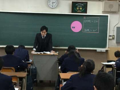 1年1組の数学の研究授業では平面図形で、おうぎ形の弧面積についての学びでした。おうぎ形の半径と中心角から弧の長さや面積を求めていました。学年主任の分部先生の授業では、色画用紙を切り抜いたものを黒板に貼り付けての説明でした。