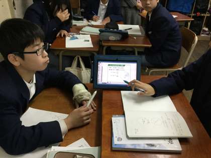 1年7組の授業では、同じ内容を4人の班形式でタブレットを利用しての学びでした。班の中でタブレットの画面を利用して、互いに説明しながら相談している場面も見かけました。