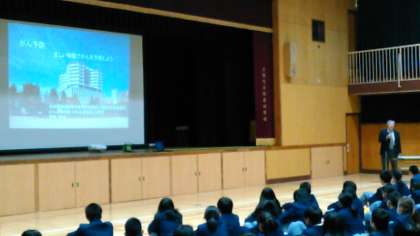 平成29年3月告示の中学校学習指導要領の保健体育保健分野では、「がんについて扱うものとする。」と明示されています。そこで、大阪市の中学校4校がモデル校として外部講師の方に来校していただき、学習することになりました。本校では、大阪病院(旧 大阪厚生年金病院)副院長・外科診療部長の畑中信良医師にご来校いただきました。