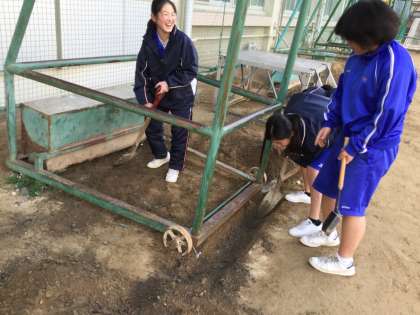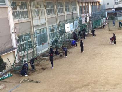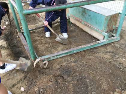このバスケットゴール10台は、長年この場所に置いてあるものも多くありました。いざ動かそうとすると砂に埋もれたりしていて、車輪の堀出しから始めることになりました。31日(水)の放課後に大勢のバスケット部員が、スコップで地面を平らにしてくれていました。