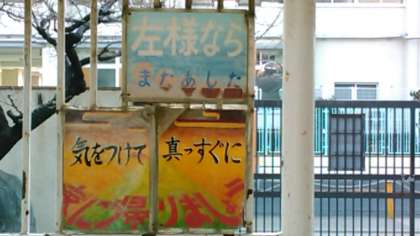 「大きな声であいさつしよう」「制服を正しく着よう」の文字があります。「お早う」「挨拶」「左様なら またあした」「気をつけて真っすぐに」の4枚のポスターは、誰の作品でしょうか?ご存じですか?