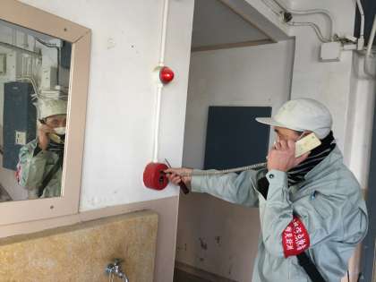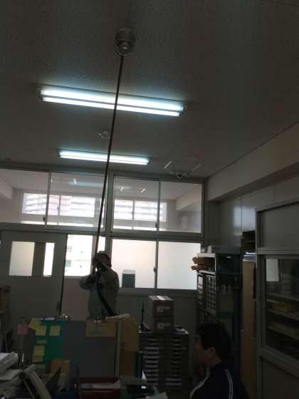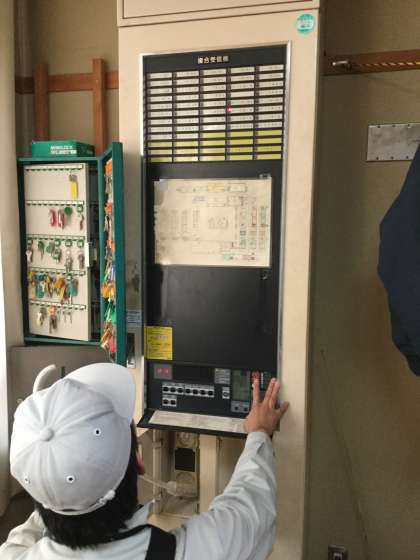 自動火災報知設備の点検では、煙感知器・熱感知器が正常に作動するか、全部の部屋での確認作業です。各部屋の熱感知機に熱源を当てて、火災報知設備の本体と1部屋ごとに連絡を取りながらの確認作業でした。