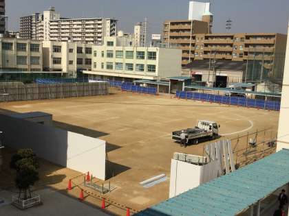 中庭の横では、工事車両通行用に塀の開口部も設けられていました。パイプの地中への打ち込みと、パネルの設置が急ピッチで進んでいきました。グランドを見るたびに景色が変わっていきます。