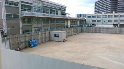 写真は、現場の正門付近からの入口の様子と職員室の前の廊下から第一グラウンドの様子です。