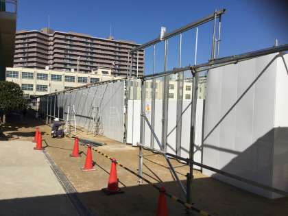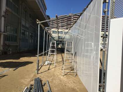 気温の上昇に合わせるかのように工事現場もハイペースで作業が進み、3号館沿いの塀を利用した仮設の渡り廊下も、パイプが組みあがってきました。