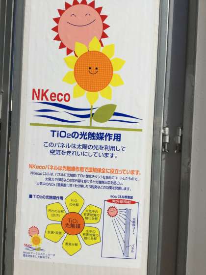 塀のパネルがきらきらと光を反射してきれいと思っていたら、酸化チタンによる光触媒作用との掲示がありました。太陽の力を利用して、窒素酸化物を分解して空気をきれいにして光り輝いているんですね。