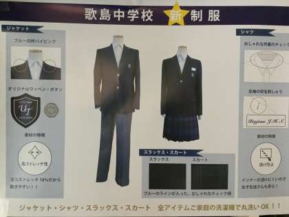 2月17日(土)に、新入生標準服・体操服のお渡しが歌島中学校にて、業者さんにより行われます。