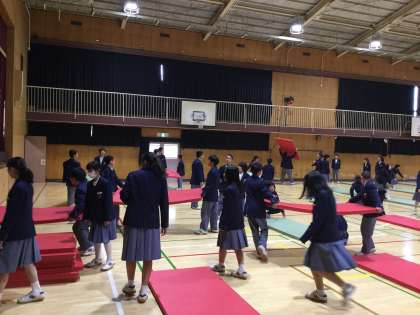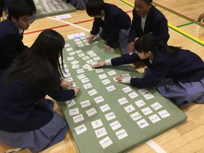 2月16日(金)5・6時間目に体育館にて、1年生の「ことわざかるた大会」が行われました。2月9日に開催予定でしたが、インフルエンザ等による学級閉鎖があり、一週間遅れの開催となりました。
