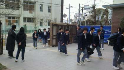 2月19日(月)の正門周りの登校の様子です。生徒達はブルーの柵を横に見ながらの登校となりました。