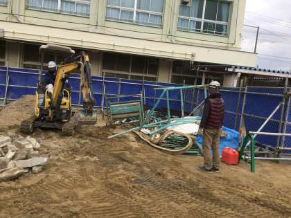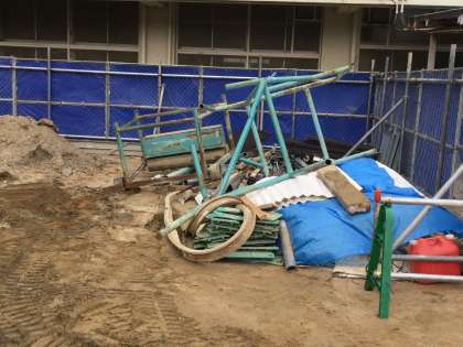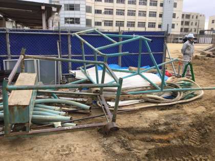 ショベルカーで広い場所に引張り出して、高鉄棒同様にディスクサンダーで4本の脚部を切断して、2分割とされました。今後重しやローラーを切り離して、細かい鉄材のパイプに解体されます。