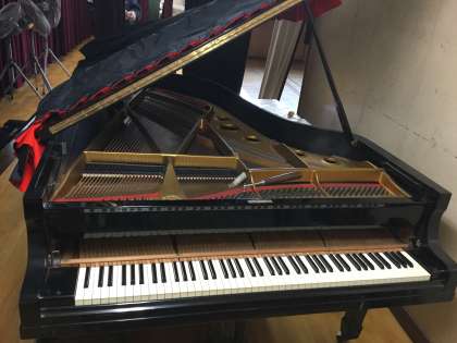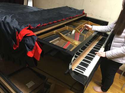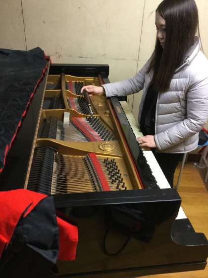 写真は体育館舞台にあるグランドピアノの調律の様子です。