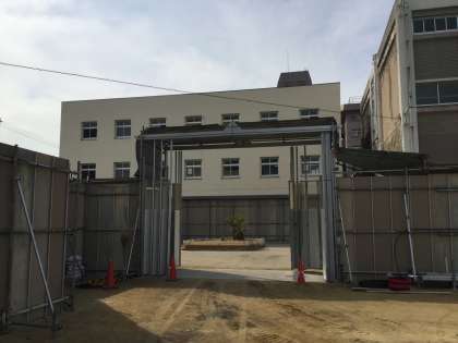 塀に設けられたゲートを通り抜けて、現場事務所に向かって歩いていくと、つい最近までとは違う異質な空間に感じました。まさに「塀の中の人々」のような感じです。どの方向を見ても、塀越しに校舎を見上げるような感じになります。塀の中に別の一つの街が存在しているかのような違った活気がみなぎっています。