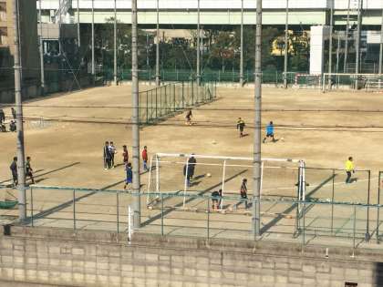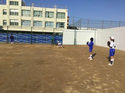第2グランドではサッカー部と陸上部がグランドを分け合って練習していました。第1グランドでは、ソフトボール部が狭いフィールドを利用して、内野の守備練習で軽やかなグラブさばきを見せていました。