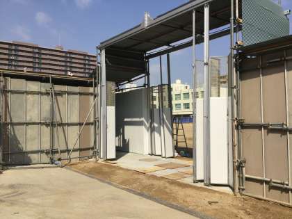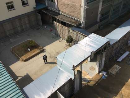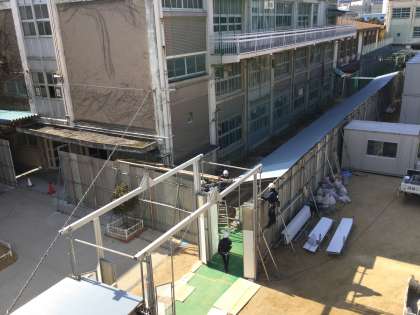 中庭を囲う高い塀に寄り添うように、渡り廊下のアングルが組み立てられてきました。そして屋根にはトタン板はられて雨対策もできました。また渡り廊下を工事車両が横切るところには、廊下の両側に開閉式のゲートが設置されました。ゲートの開閉操作はガードマンさんが行われます。