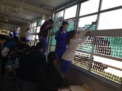 3月2日に各クラス総出で、廊下のガラス面に葉っぱの貼り付け作業でした。