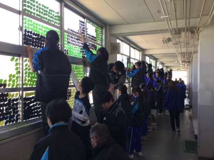 3月2日(金)学年末テスト終了後の午後、4号館の2・3階廊下で、1・2年生の生徒と教師が協力して作品制作をしました。4号館校舎の窓に大きな文字を映し出したビッグアートです。