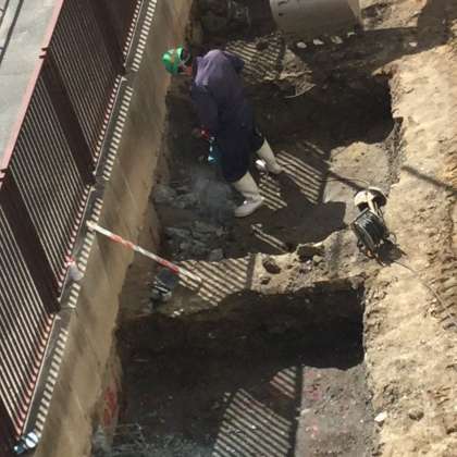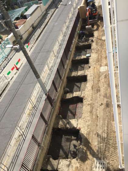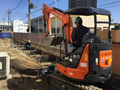 自転車置き場の支柱の基礎になる場所が、枡のように四角くショベルカーで上手に掘られていきます。一列に等間隔に規則正しく並んでいます。掘られた後から、駒止柵の地下部分での出っ張りが、削岩機で砕かれていきました。