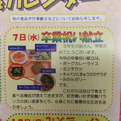 職員室前に掲示してある給食のメニューに、3月7日(水)注目献立「卒業祝い献立」とありました。来週の卒業式を前にして、3年生は9日の金曜日が、最後の給食・昼食持参日となります。3学年の生徒で祝うの給食メニューでした。