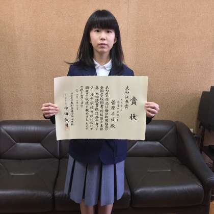 「読書感想画中央コンクール」において、大和証券賞を受賞した2年生の菅原さんの表彰式を校長室で行いました。