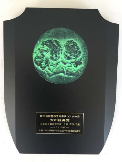 毎日新聞社より、表彰状と楯が送られてきました。楯は美術系大学の元教授によって製作され「歓(よろこび)」と名づけられた、重厚感あふれる立派なものでした。